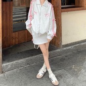 【即納:トップスM】アウター パーカー トップス スウェット ジップ チャック リボン ストライプ ライン入り 長袖 春 秋 ゆったり かわいい おしゃれ ガーリー 甘め 韓国ファッション レディース お出かけ